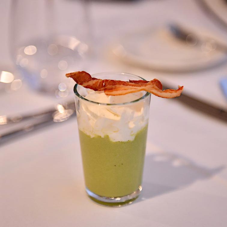 • Velouté d’asperge verte, chips de lard